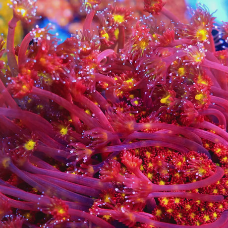 Candy cane corals are a common aquacultured species that are abundantly available and well acclimated to captive environments. Two stunning examples are Top Shelf Aquatics Kryptonite and Cursed Candy Cane, which have been aquacultured for nearly a decade.