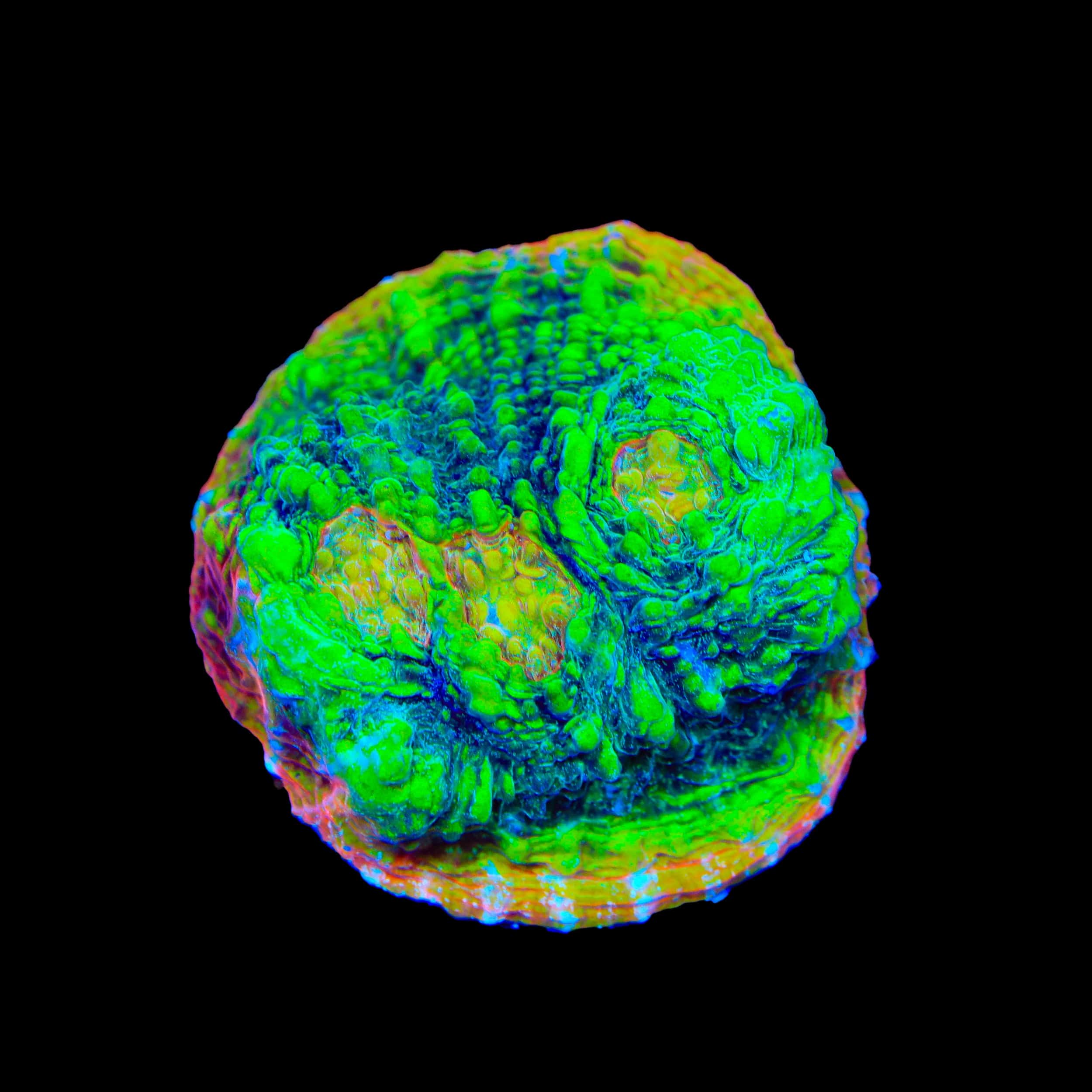 Chalice corals are renowned for their vibrant colors and intricate patterns, often showcasing stunning rainbow hues with a mix of electric greens, purples, reds, oranges, and blues. Their unique pigmentation is influenced by water quality, lighting spectrum, and supplemental feeding. Deep blue lighting enhances their vivid coloration, while balanced lighting promotes steady growth.