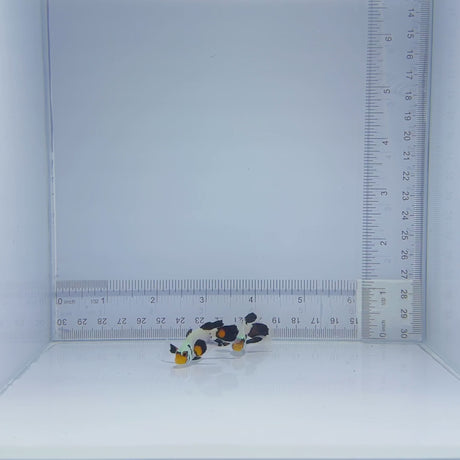 Premium Frostbite are a Flurry variant. Like the Flurry they have all bars connecting covering the entire body in milky white in color sometimes with a sapphire hue. Black margins are found on all the edges of every fin, however they are jagged lines like that of the snowflakes. They have an orange face mask, and some orange coloring can be found on the pectoral fins and possibly on others. What sets them apart is there are black dots on the sides of the fish with 10 dots or more.