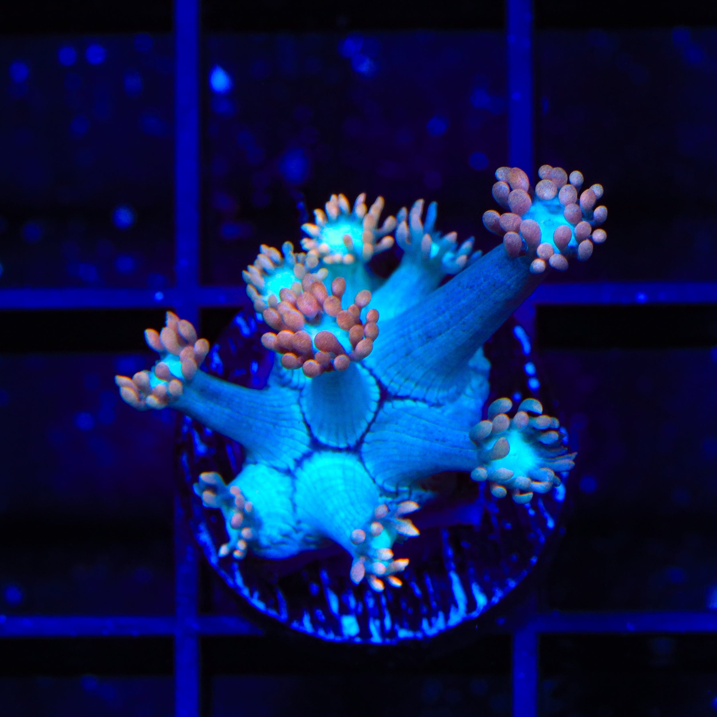 Typically showcasing hues of green, yellow, pink, or purple, Goniopora corals create a mesmerizing display as their polyps extend and sway with the flow of water. Known for their moderate care requirements and adaptability, they are an excellent choice for intermediate reef keepers looking to add a dynamic focal point to their aquascape.