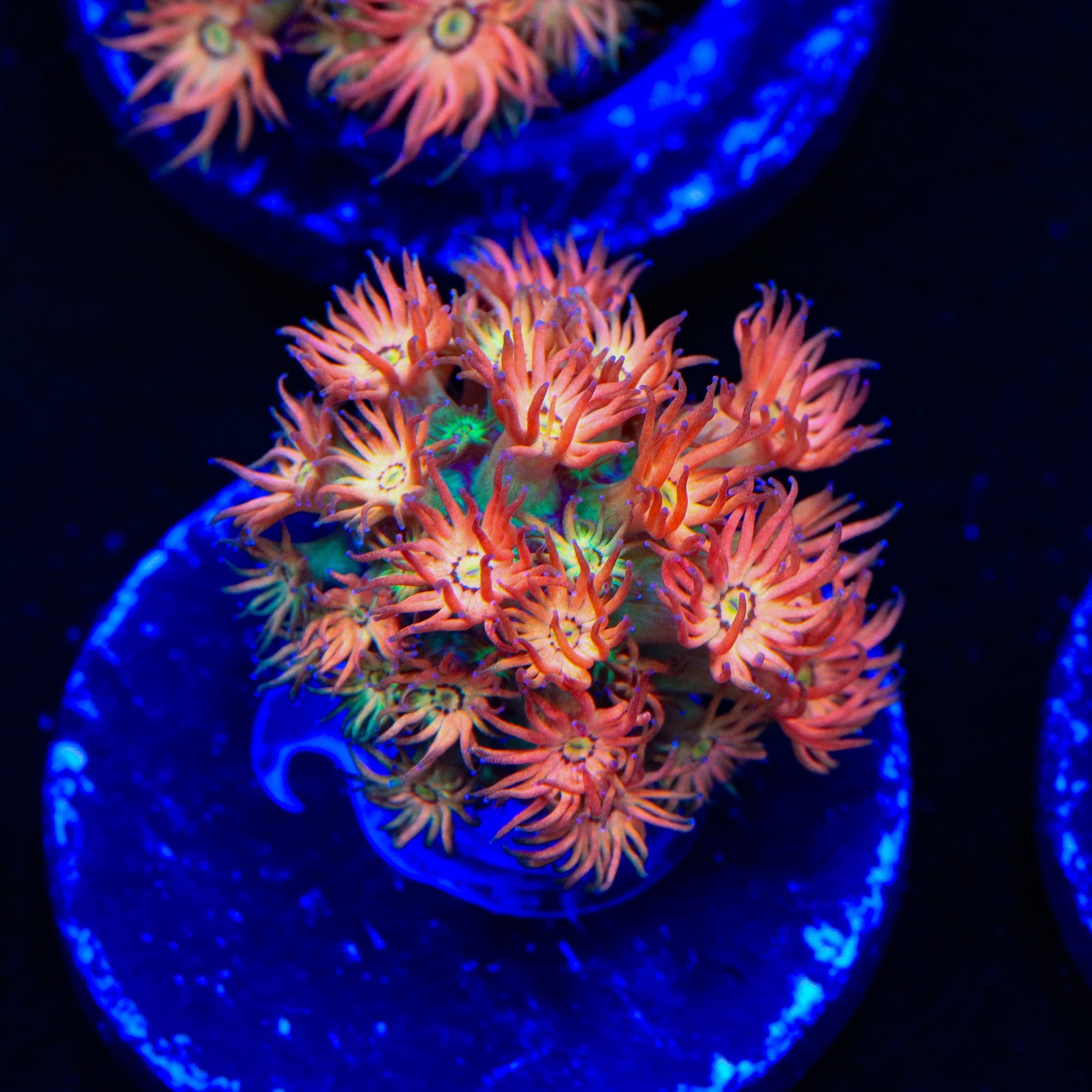 Typically showcasing hues of green, yellow, pink, or purple, Goniopora corals create a mesmerizing display as their polyps extend and sway with the flow of water. Known for their moderate care requirements and adaptability, they are an excellent choice for intermediate reef keepers looking to add a dynamic focal point to their aquascape.