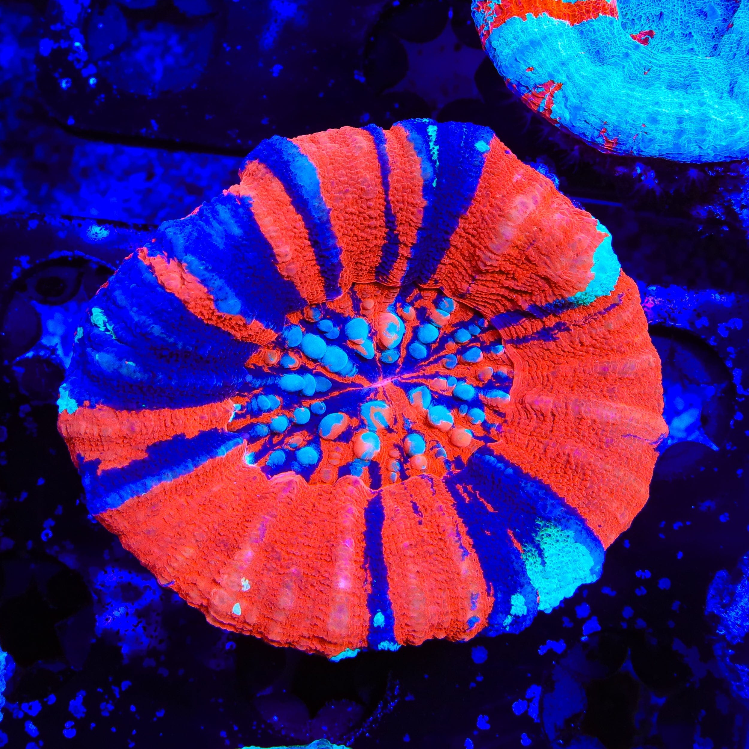 Scolymia corals, often called Scolies, are a highly sought-after type of Large Polyp Stony (LPS) coral prized for their bold colors and unique circular shape. These corals display a stunning array of hues, including reds, oranges, greens, purples, and blues, often with intricate patterns or gradients that make each specimen one of a kind.