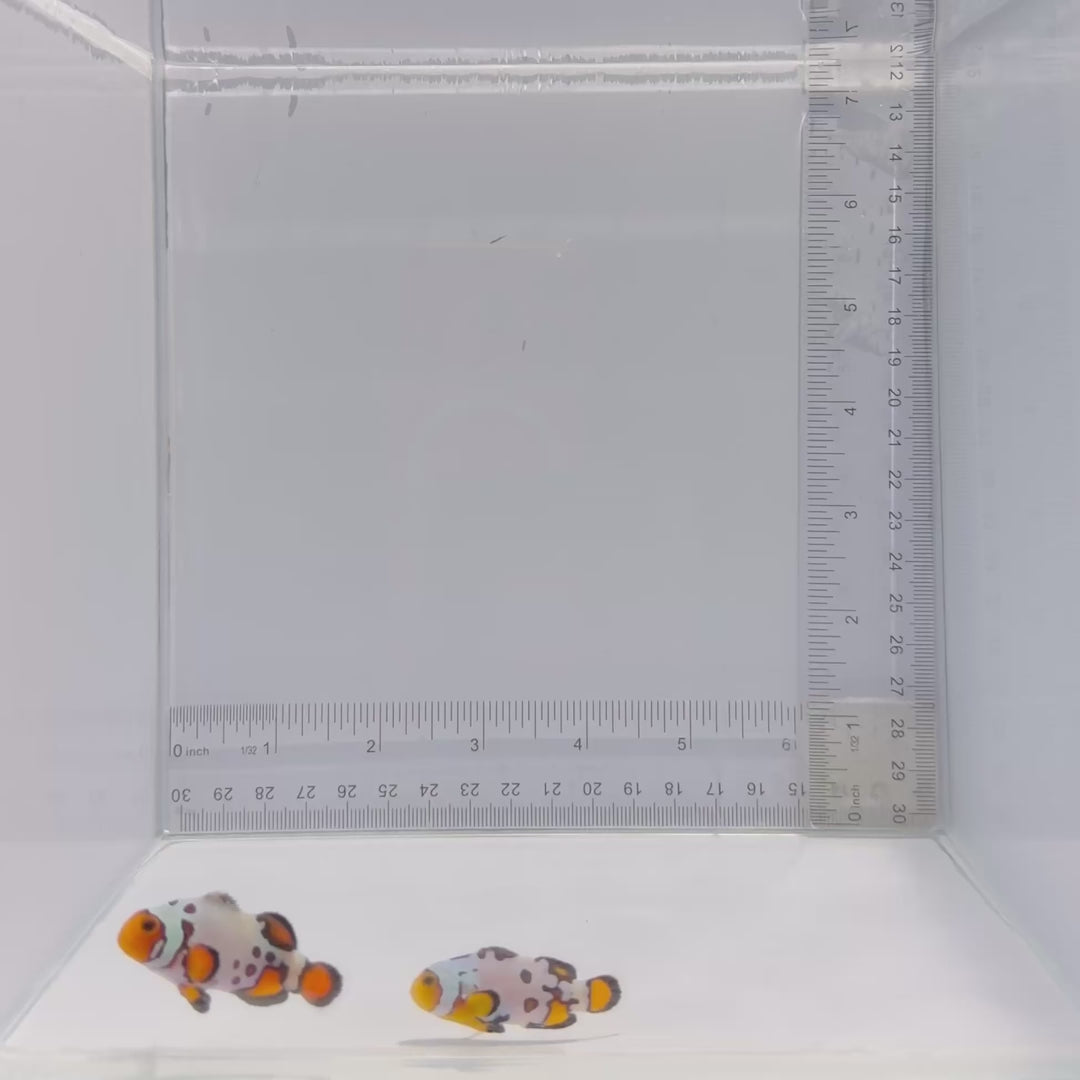 Clownfish come in a wide variety of colors and patterns, with many aquacultured morphs available. Some of the most popular species include: Ocellaris Clownfish (Amphiprion ocellaris) – Classic "Nemo" appearance, available in wild-type and designer morphs Percula Clownfish (Amphiprion percula) – Similar to Ocellaris but with brighter colors and thicker black outlines Maroon Clownfish (Premnas biaculeatus) – Deep red coloration, highly territorial and best kept alone or in pairs Snowflake Clownfish (Amphiprion ocellaris variant) – White and orange designer morph with irregular banding