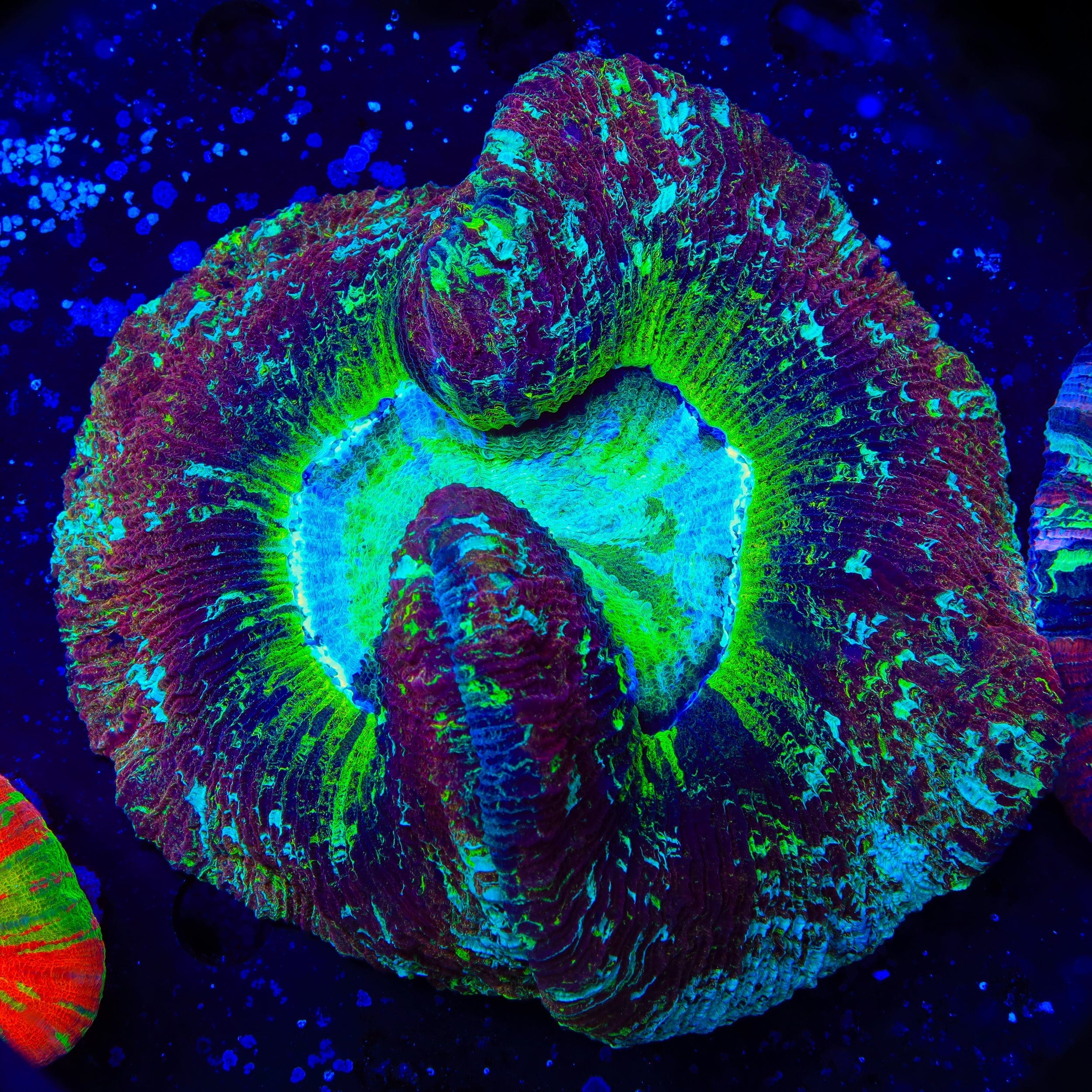 Trachyphyllia are renowned for their striking coloration, with hues ranging from metallic greens and fiery reds to purples and blues. Many specimens feature intricate gradients or marbled patterns that become even more pronounced under blue-spectrum lighting.