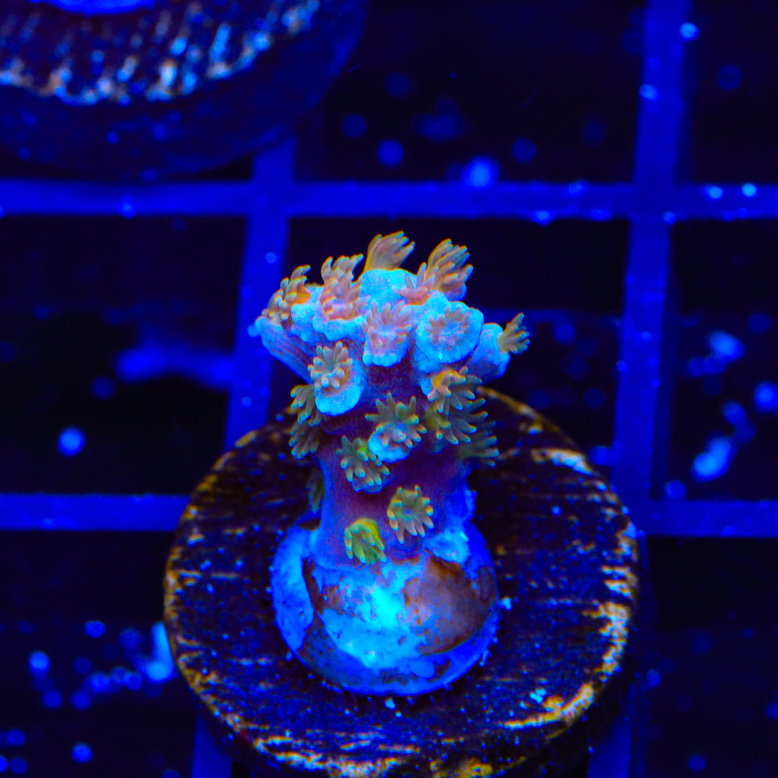 Acropora corals are known for their incredible coloration, which can vary dramatically depending on tank conditions. Lighting spectrum plays a significant role, with deeper blue lighting enhancing vibrant colors while whiter light promotes faster growth. Feeding with nutrient-rich foods, such as our Royal Flush blend, provides not only essential nutrients but also fatty acids and amino acids that enhance pigmentation and promote healthy tissue development.