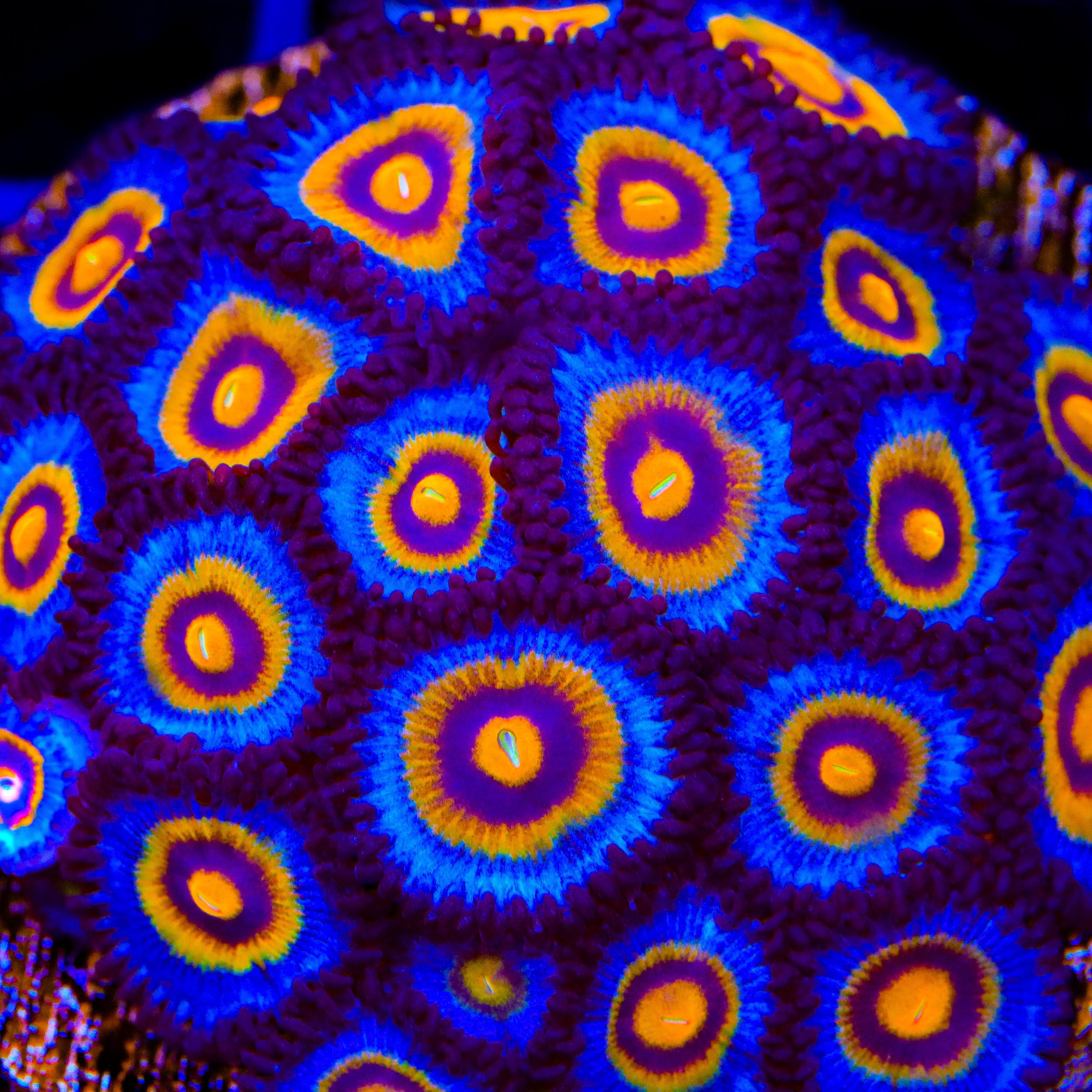 Feeding Zoanthids with nutrient-rich foods like Reef Roids, amino acids, and plankton blends supports their pigmentation and overall health. Stable water parameters and trace elements, such as iodine and iron, further enhance their vibrant appearance.