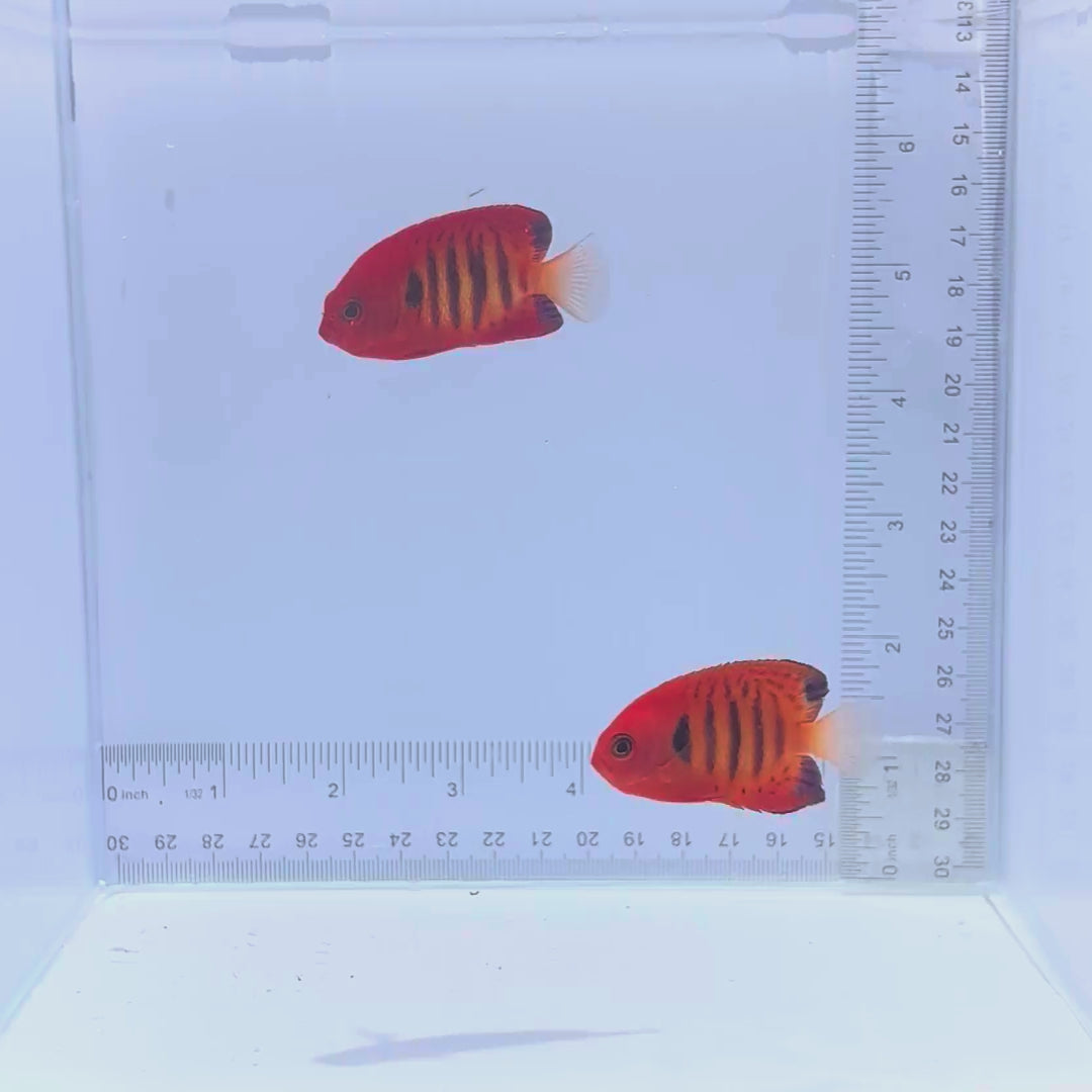 The Flame Dwarf Angelfish is a reef favorite, ablaze with bright orange-red coloration, vertical black bars, and electric blue edging along its fins. Native to the coral-rich reefs of the Central and Western Pacific, this compact angelfish combines bold color with a confident, lively personality. It’s a stunning centerpiece for tanks where beauty meets movement.
