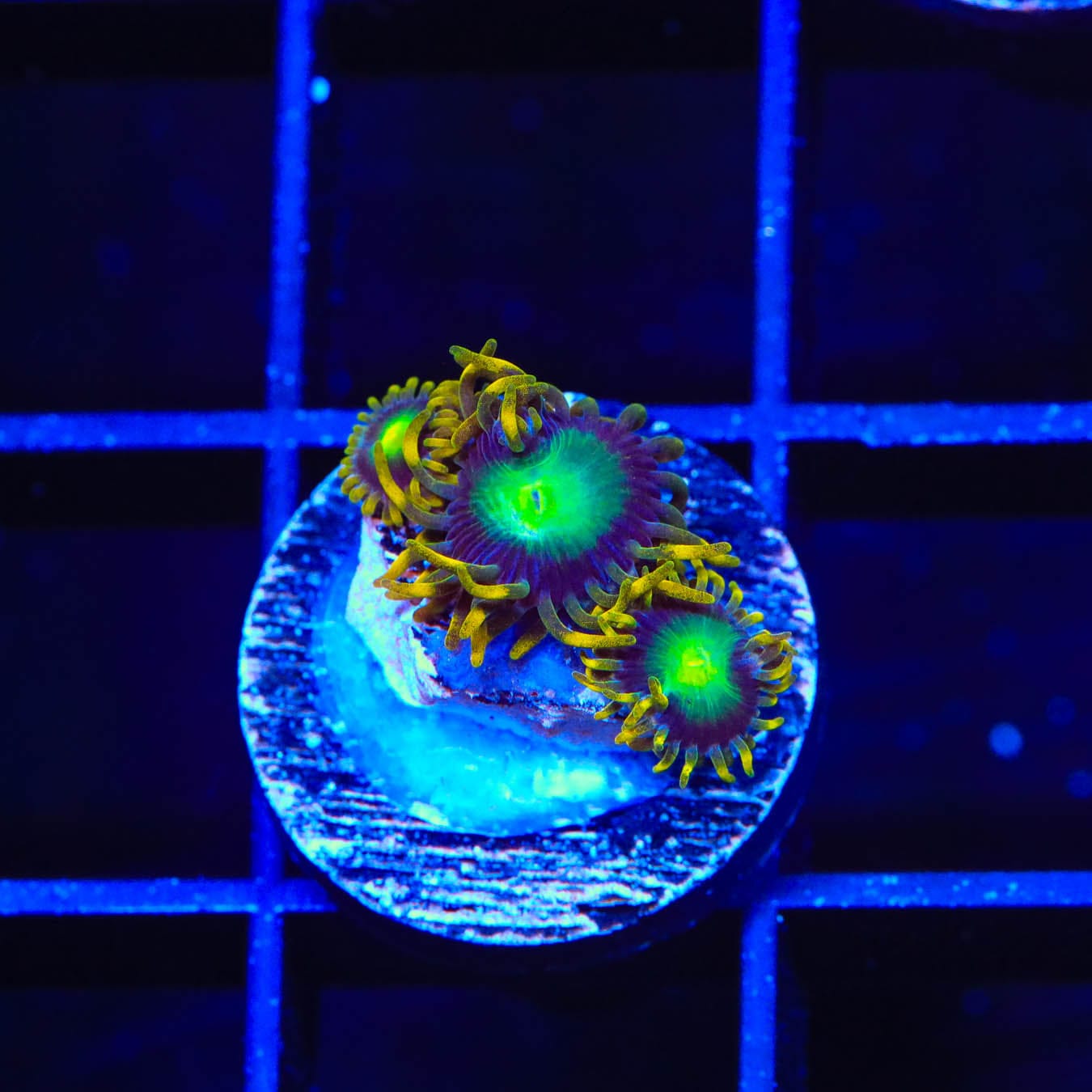 Zoanthids, like the Radioactive Dragon Eye, are a favorite among hobbyists not just for their stunning appearance but also for their resilience and ability to adapt to different light and flow conditions. They are a type of soft coral, known for their soft, fleshy texture and colonial nature. Alongside, Zoanthids can create a carpet of color across your rockwork or sandbed, making them a dynamic and visually appealing element of any marine aquarium. Explore our collection to find more about this unique zoanthid and how it can transform your aquatic space.
