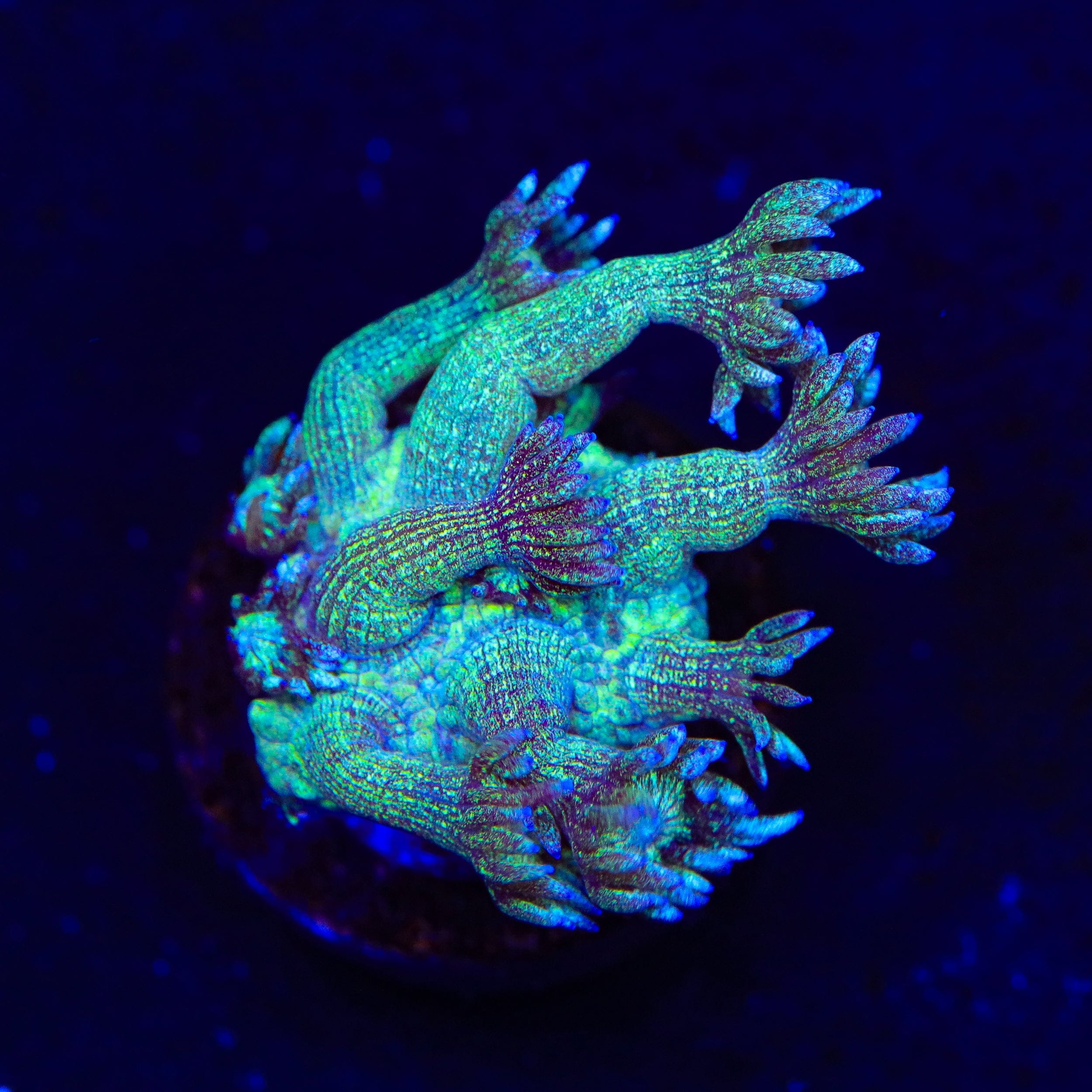 Typically showcasing hues of green, yellow, pink, or purple, Goniopora corals create a mesmerizing display as their polyps extend and sway with the flow of water. Known for their moderate care requirements and adaptability, they are an excellent choice for intermediate reef keepers looking to add a dynamic focal point to their aquascape.