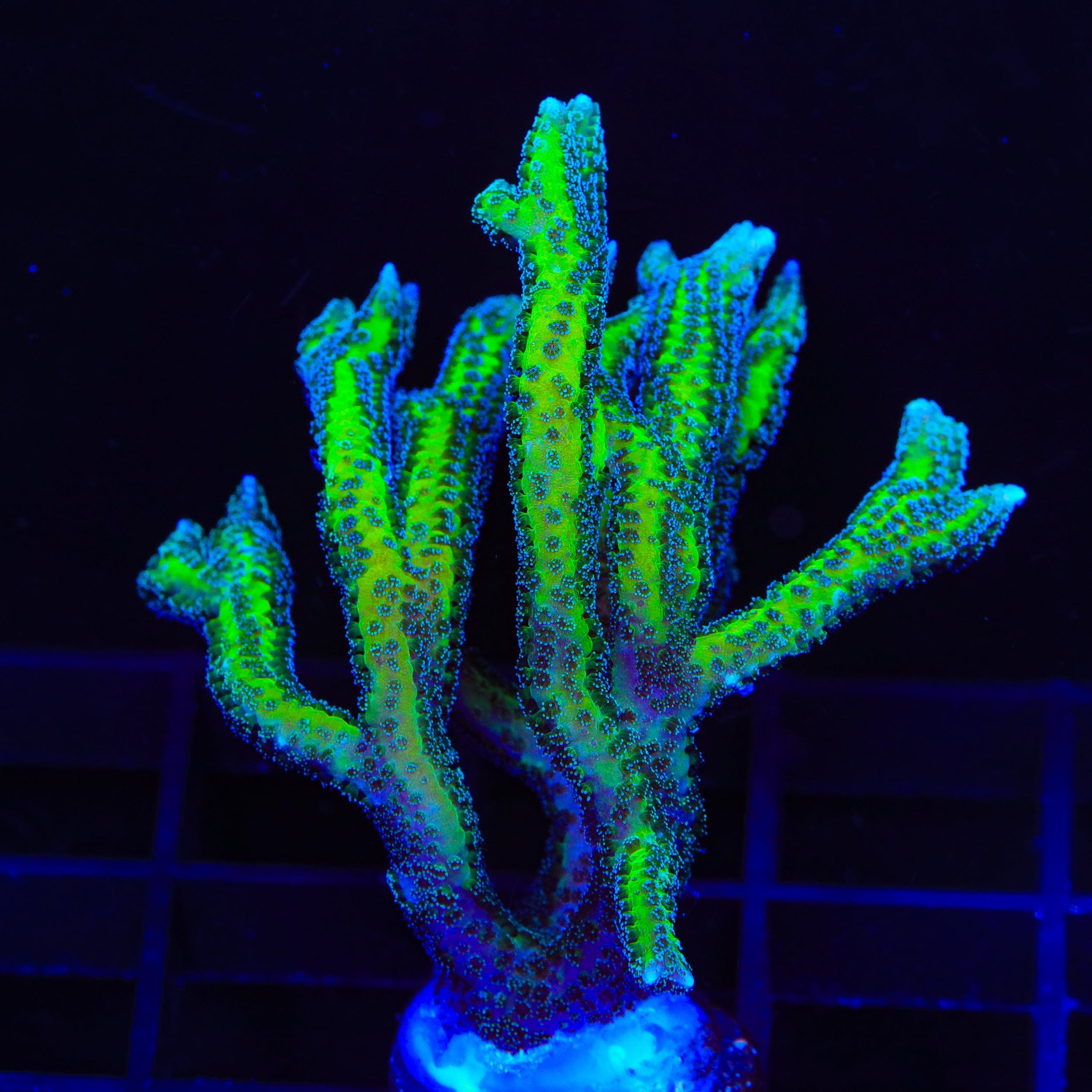 Birdsnest corals are admired for their vibrant colors, which include pink, green, yellow, and purple varieties. These tones are further enhanced under blue-spectrum lighting, which highlights their fluorescent qualities and showcases their intricate branching structure. Maintaining stable water parameters, proper lighting, and consistent water flow is essential for preserving their vibrant hues.