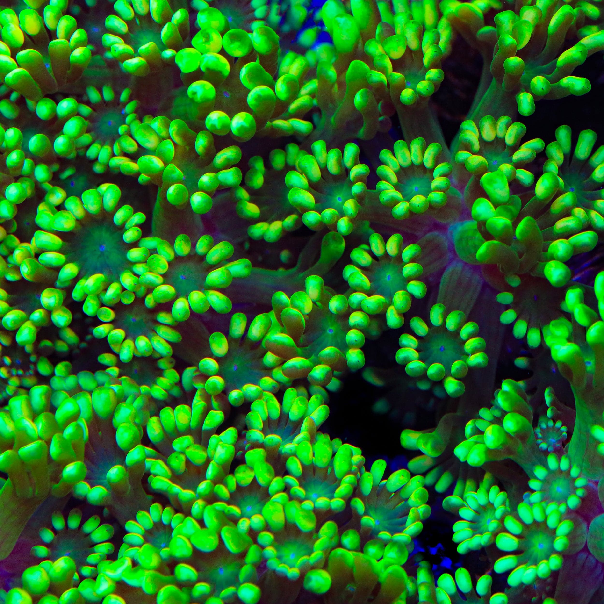 Typically showcasing hues of green, yellow, pink, or purple, Goniopora corals create a mesmerizing display as their polyps extend and sway with the flow of water. Known for their moderate care requirements and adaptability, they are an excellent choice for intermediate reef keepers looking to add a dynamic focal point to their aquascape.